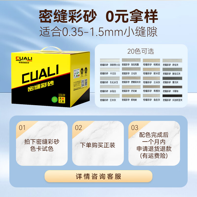 CUALI砖丽®是中山市卡施力顿建材有限公司旗下品牌,是全球领先的自研、自产、自销的胶粘剂及装饰辅材企业。产品线丰富全面,主要产品有:美缝剂、聚脲美缝剂、水瓷、水性环氧彩砂填缝剂、亚光砂瓷、醇型美容胶、岩板胶、施工辅材等,实现了所有美缝产品的现场定制调色。产品通过或符合:法国室内空气环境A+标准、德国EC环保标准、RG标准及0级防霉标准、FDA食品接触材料测试标准等。目前在全国有500+专卖店和1500+服务中心,能在绝大多数城市提供24小时内上门测量和施工服务。