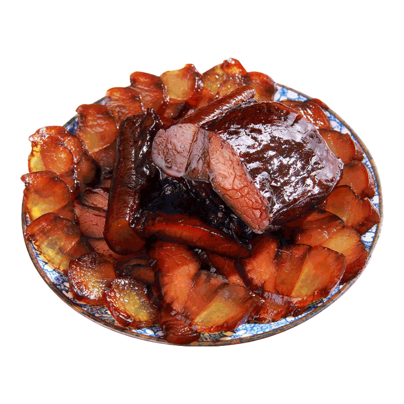 青城山老腊肉是四川成都都江堰市青城山名菜,以肉源绿色、制作工艺传承历史悠久、肉味鲜美、可长时间存放等特点深受中外游客青睐。青城山老腊肉外观呈黑黄色,层次分明、肉皮金黄,具有光泽,瘦肉外观呈黑红色,切开呈玫瑰色。香味浓郁,入口清香,回味悠长。食用方法多样且方便,可蒸、可炒、可炖汤。
