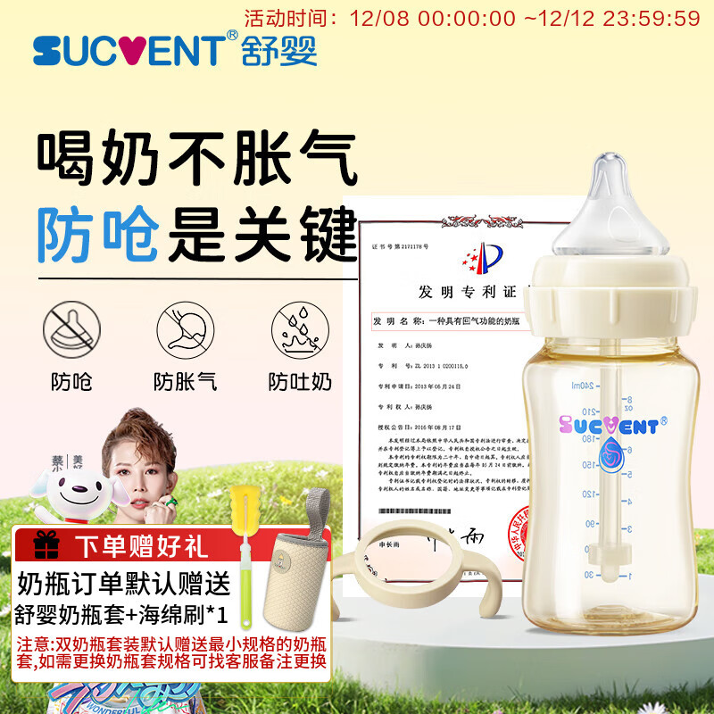 广州舒婴婴儿用品公司,是一家十五年只专注婴幼产品研发、生产、产业整合婴幼产品联盟合作等业务的一体化企业。开发的全新理念的婴儿奶瓶舒婴Sucvent品牌。让每个家庭的宝贝“舒适快乐”!舒婴Sucvent品牌中国首创无泡防呛奶瓶,荣获国家和国际发明专利的内置导气系统,无泡,防呛奶防胀气,减少营养流失的恒压专利系统。