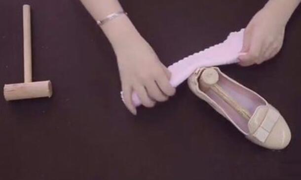 新皮鞋的鞋底磨脚,套在鞋拐子上,用铁锤用力敲击,将磨脚处敲击平坦即可,如没有鞋拐子,也可用别的铁器代替