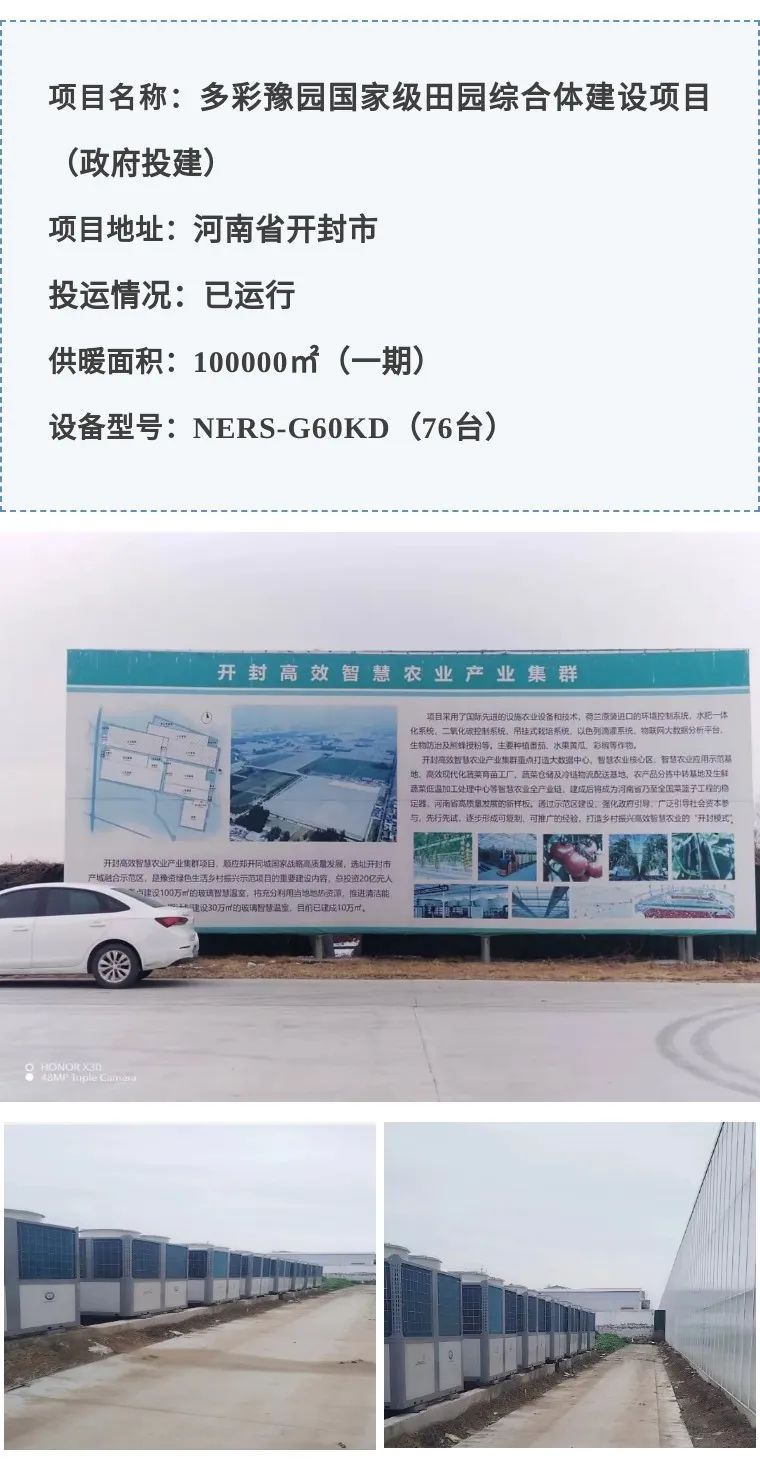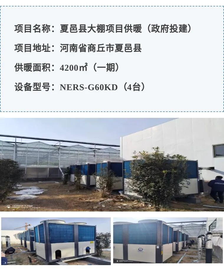 本项目是夏邑县政府投资的新型农业项目,种植蔬菜经济作物。室内平均温度要求16-18度,一期采用4台NERS-G60KD,替换之前的燃气锅炉,更加节能安全。管道设计采用铝皮外护,美观大方。