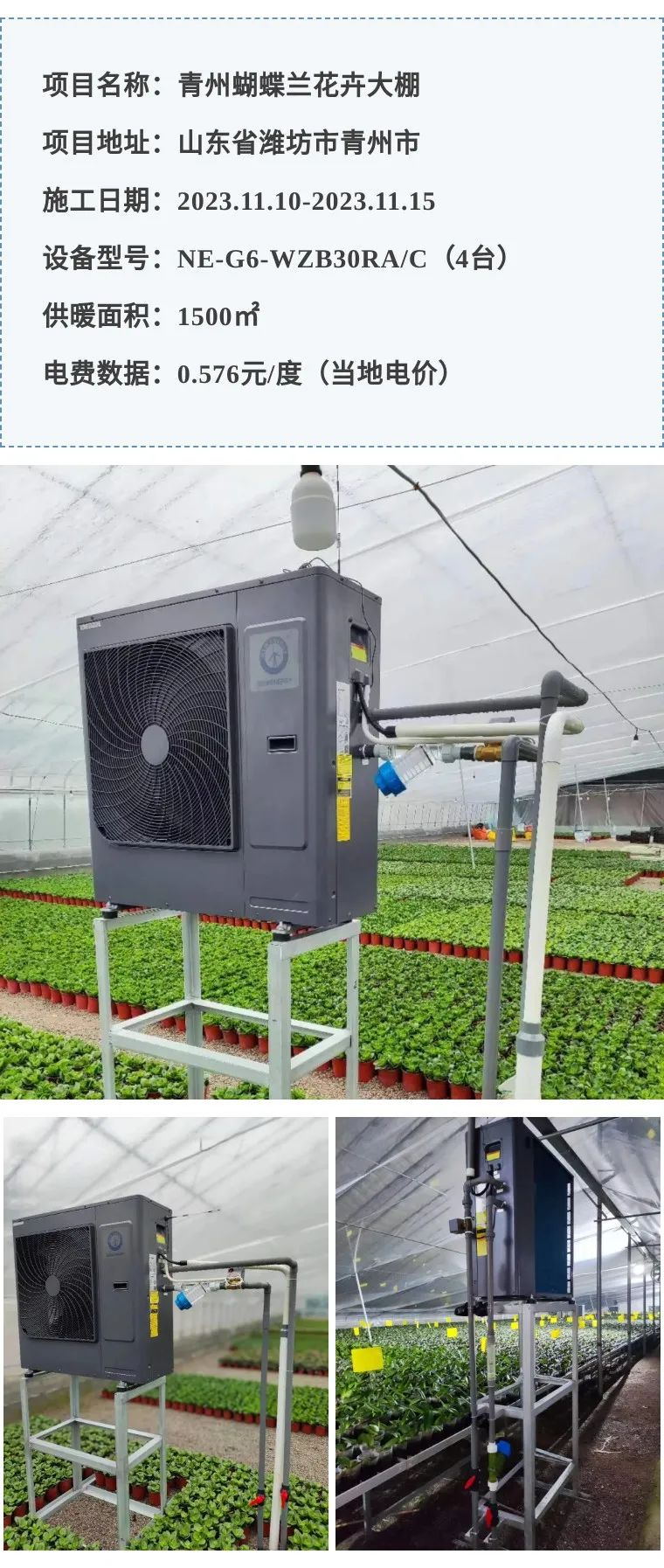 项目为新建花卉大棚,采用纽恩泰花卉大棚机4台,变频恒温控制,自带物联网功能手机APP操作,故障告警,管理非常方便,温度控制更精确,比传统采暖方式节能60%。