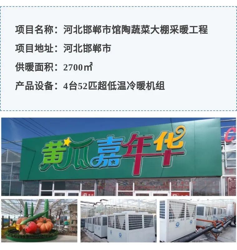 河北省馆陶县寿山寺乡是有着近30年黄瓜种植的美丽小镇,该观光大棚采用纽恩泰4台52匹超低温冷暖机组提供恒温舒适的环境,棚内高度达8米,温度可达22℃,末端采用风盘供热。