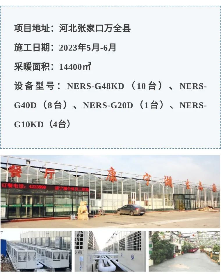 张家口康宁湖生态园是2014年当地政府规划打造的集观光、餐饮、温泉、垂钓、采摘、休闲、渡假为一体大型生态农业观光园。占地2670亩,投资5800万元,采用纽恩泰超低温冷暖热泵10台NERS-G48KD、8台NERS-G40D、1台NERS-G20D、4台NERS-G10KD,为餐厅6600M²,采摘大棚6500M²,办公楼300M²,养殖园800M²,猴子园200M²提供冷暖舒适保障。
