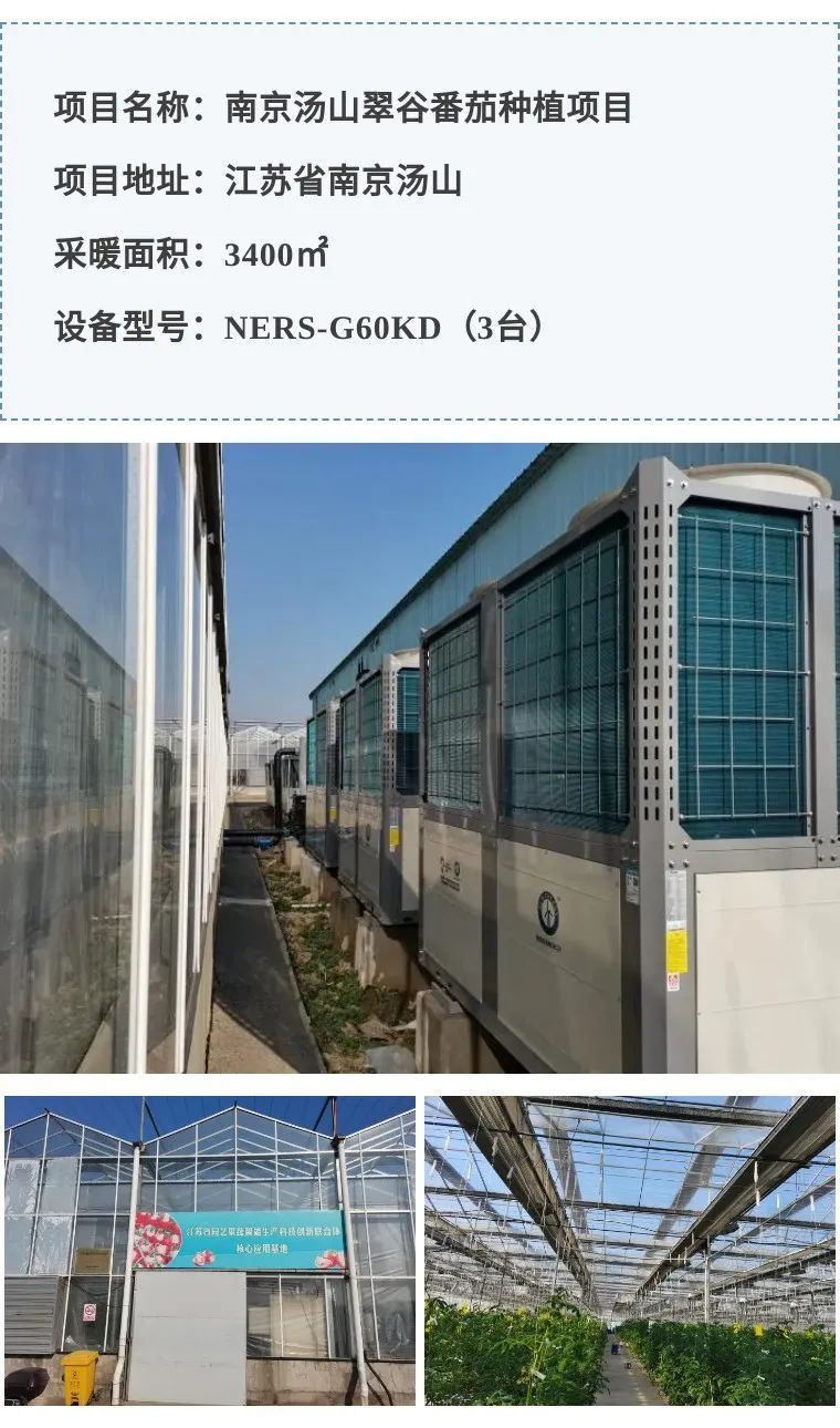 南京汤山翠谷番茄种植项目,配置纽恩泰 NERS-G60KD 空气源热泵机组3台,为3400M²大棚种植提供恒温。